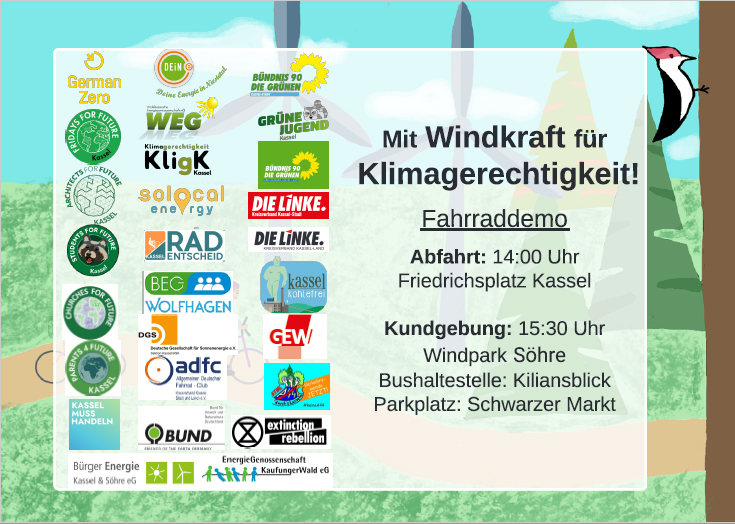 Mit Windkraft für Klimagerechtigkeit Mit dem Fahrrad zum Windpark Söhre. Start Samstag 5.3.2022 14:00 Uhr vom Friedrichsplatz Kassel.